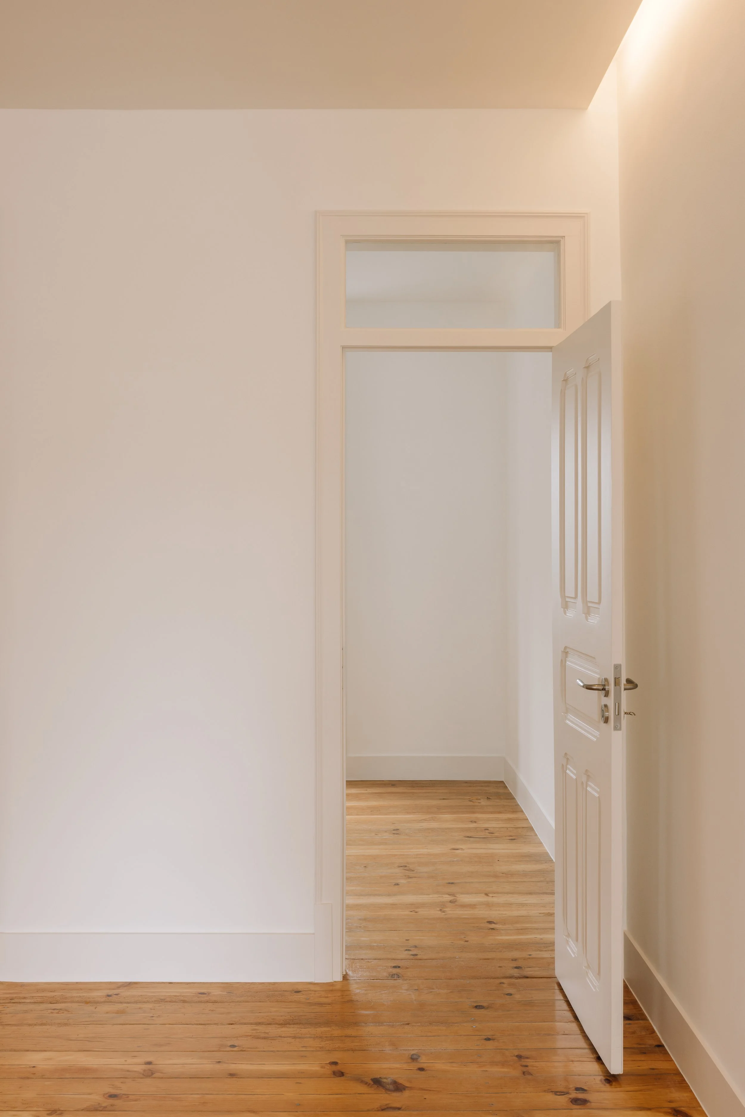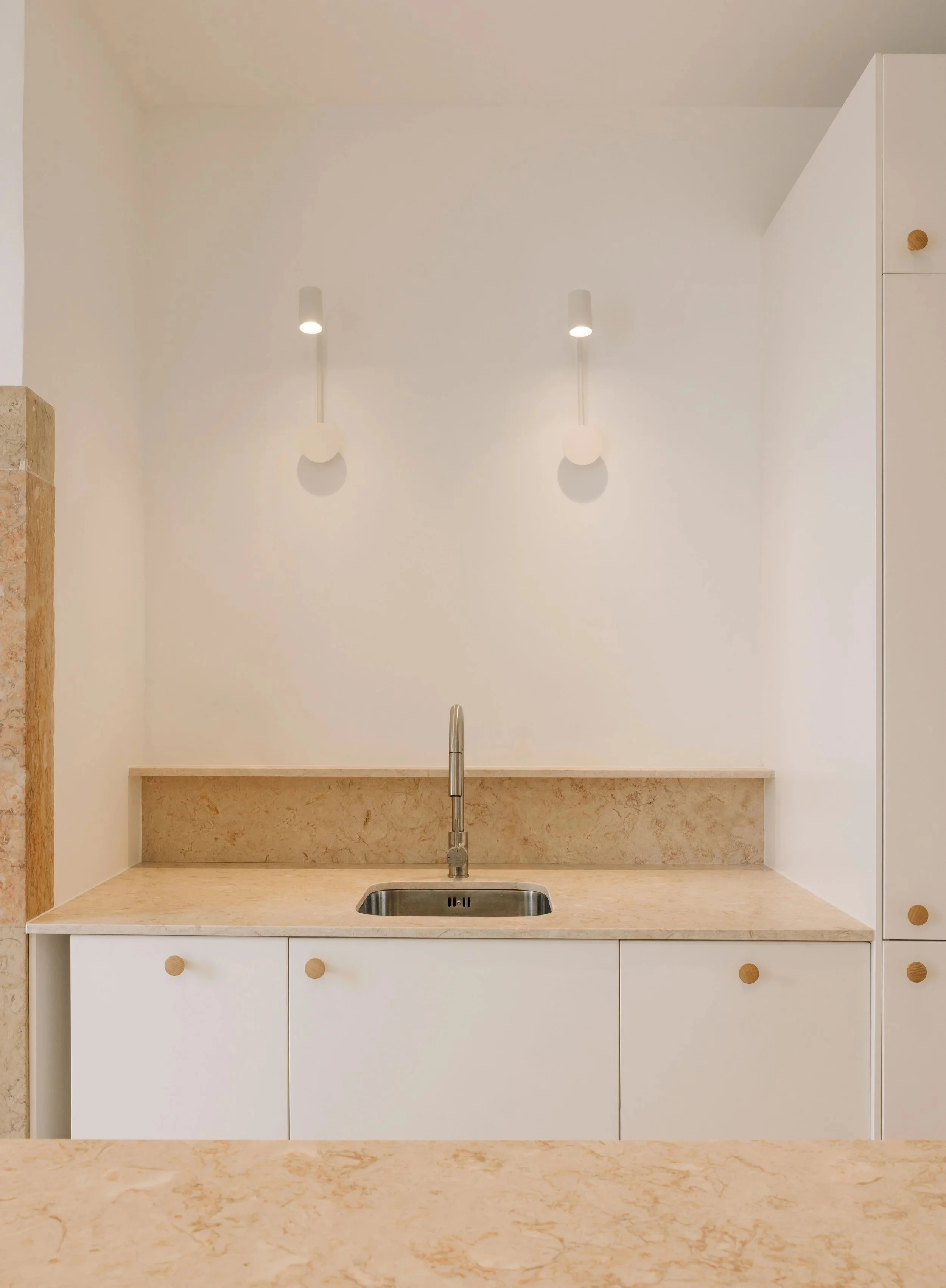 Material choices were guided by a philosophy of reuse and continuity. The original wooden floors were carefully restored, reinforcing warmth and authenticity. Portuguese natural stone, previously used in the kitchen chimney, was preserved and extended into the kitchen and bathroom wet areas. Where original finishes were unrecoverable, a seamless microcement surface was introduced, reducing material transitions, eliminating joints, and enhancing the perception of space.